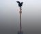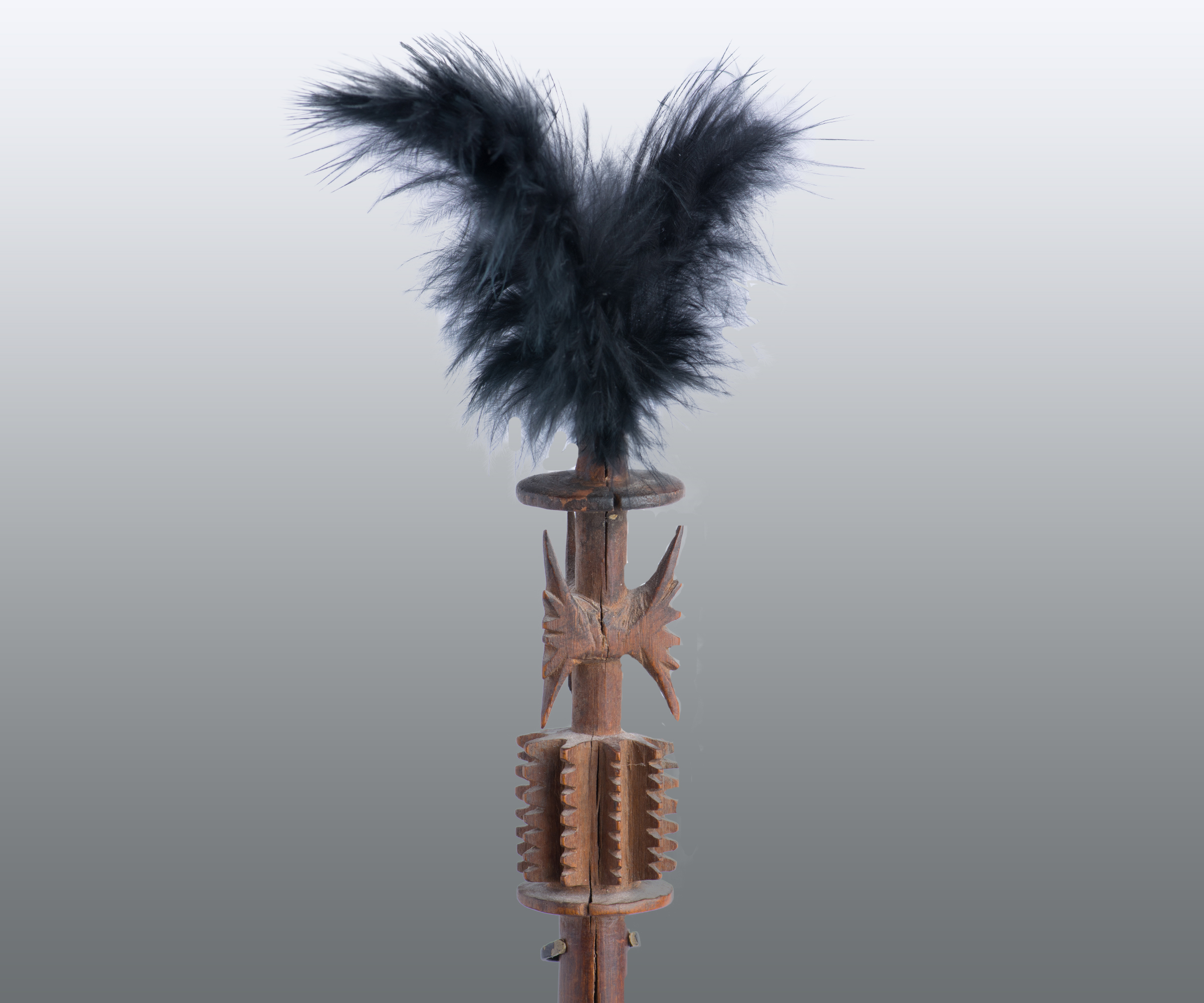 Carved hardwood. The feathers are a later replacement.