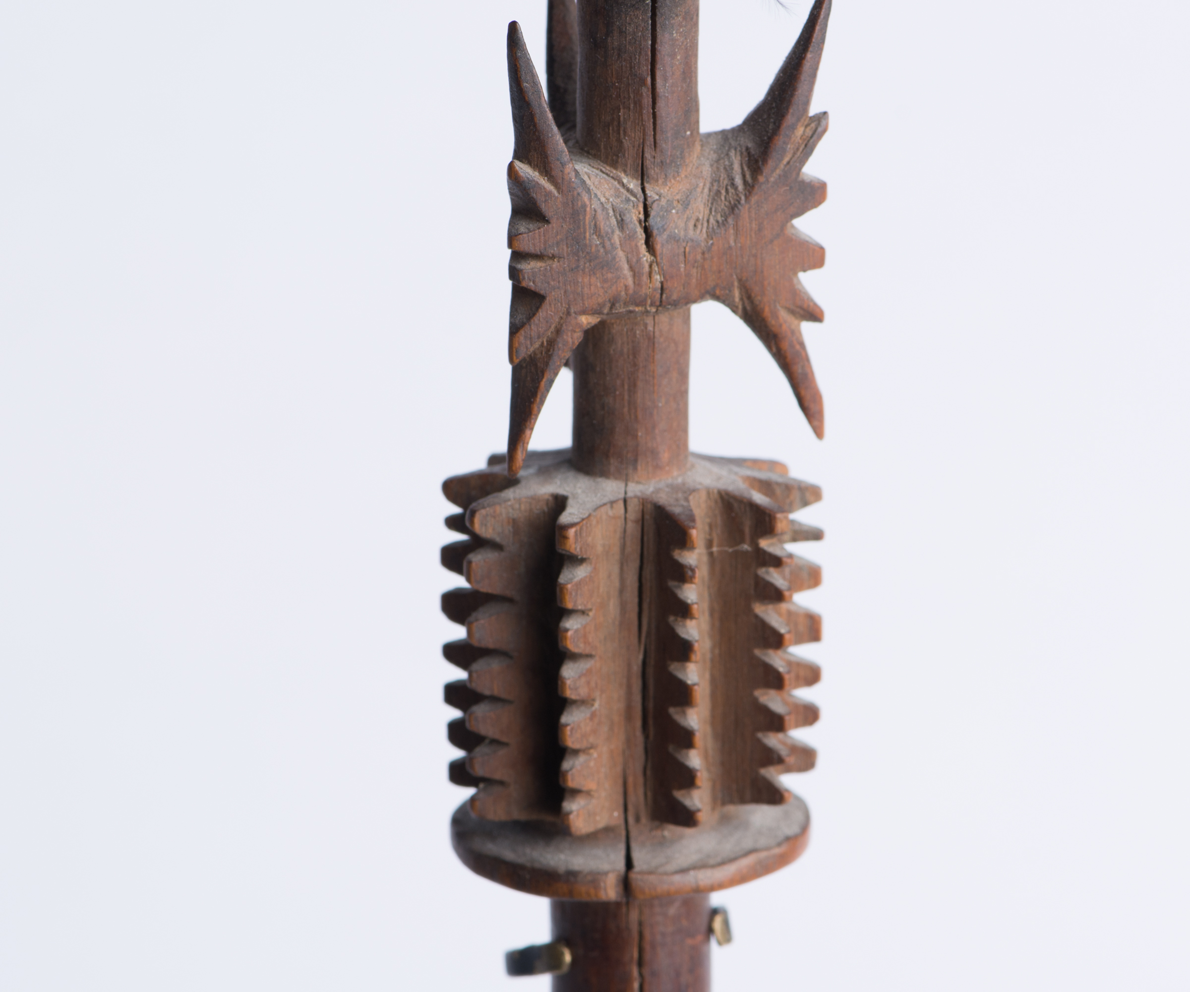 This was carved from one piece of hardwood. It is a decorative ornament rather than a functional comb. The long teeth are arranged in a circle designed to slide into the male wearer's thick hairdo and stay in place as an ornament.